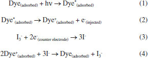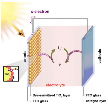 ![]() Figure 1. The image depicts, in a simplified way, the composition and operation of a DSSC-type solar cell. Note that the yellow circles represent TiO2 nanoparticles, while the red circles depict dye molecules attached to the nanoparticles. In addition to the previously mentioned components, this figure also illustrates sunlight as it illuminates the solar cell