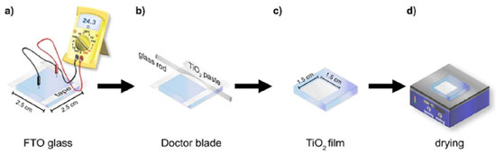 ![]() Figure 2. Image showing the operation sequence used in the doctor blade technique for depositing the semiconductor layer: (a) identification of the conductive surface of the glass and limitation of the active area of the cell with adhesive tape, (b) deposition of water-based white paint pigment, using a glass rod, (c) removal of the adhesive tape and subsequent (d) drying under the heating plate