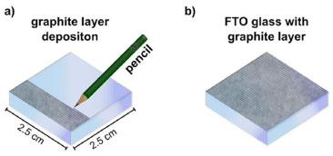 ![]() Figure 3. Image demonstrating the graphite counter electrode manufacturing procedure: (a) rubbing the pencil against the conductive side of the glass, and (b) glass completely coated with graphite