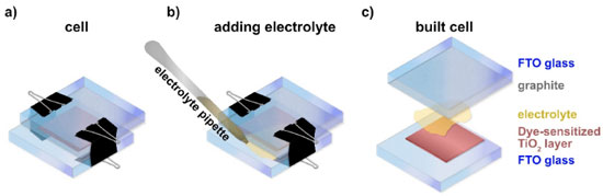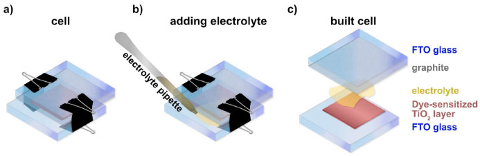 Closing and inserting the electrolyte After preparing the electrodes, they are connected together in a "sandwich" configuration, with the two conductive and coated sides facing inward, using binder clips. At the ends of the FTO glass plates, space is reserved for attaching "alligator clips" connectors to establish electrical contact between the positive side (counter electrode) and the negative side (photoelectrode), as shown in Figure 4a. To fill the gap between the electrodes, an electrolytic solution containing iodide/triiodide ions is introduced using a syringe with a needle, a Pasteur pipette, or a dropper. A commonly used option is a 5% Lugol solution (a pharmaceutical product), but a 2% iodine tincture can also be a suitable alternative. Figure 4c provides a detailed illustration of the composition and structure of the assembled cell.