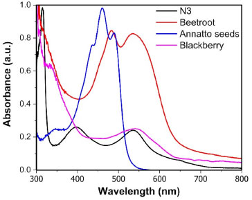 RESULTS AND DISCUSSION The efficiency of a DSSC cell is inherently linked to the dye/photosensitizer, as it is responsible for the cell's ability to absorb electromagnetic radiation in the visible region. This is because pure titanium dioxide (TiO2) exhibits an absorption band in the ultraviolet region and a limited response in the visible region. Sensitizing TiO2 with a photosensitizer dye becomes essential to broaden its response in the visible spectrum, allowing for greater absorption of light and, consequently, improving the efficiency of solar energy conversion to electricity. Figure 6 displays the absorption spectra in the UV-Vis region of natural dyes extracted from blackberries, beetroot, and annatto seeds, as well as the commercial N3 dye.16