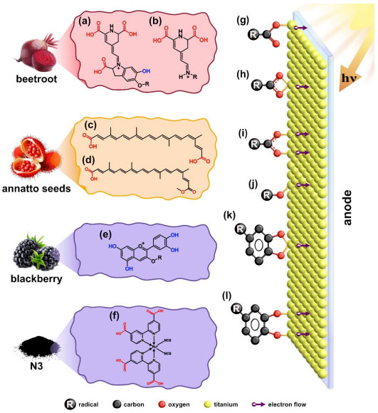 ![]() Figure 7. Main chemical compounds present in the dyes obtained from beetroot: (a) betacyanin and (b) betaxanthin; annatto seeds: (c) norbixin and (d) bixin; blackberry: (e) cyanidin; (f) commercial dye N3 and anchoring mode on the surface of the TiO2 semiconductor by the carboxylic group: (g) monodentate ester; (h) bidentate chelate; (i) bidentate bridge, hydroxyl; (j) monodentate and catechol; (k) bidentate mononuclear chelate; (l) bidentate dinuclear bridging link