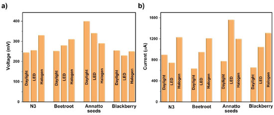 ![]() Figure 8. (a) Voltage and (b) current results obtained for photovoltaic devices built with different photosensitizers/dyes and excitation sources