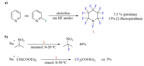 Em 1964 foi reportada a síntese do primeiro reagente de fluoração contendo a ligação N-F, o perfluoro-N-fluoropiperidina, por fluoração eletroquímica de piridina ou 2-fluoropiridina (Esquema 1a). Em razão do baixo rendimento, esse reagente não se tornou popular, porém abriu as portas para o desenvolvimento de diversos reagentes de fluoração N-F.19 Dois exemplos de apliçação desse primeiro reagente de fluoração estão ilustrados no Esquema 1b.