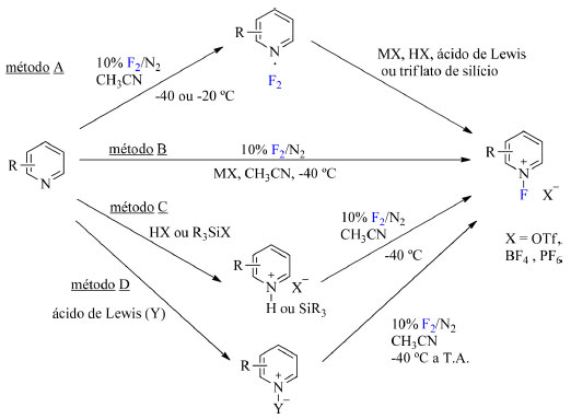 ![]() Esquema 2. Métodos para sintetizar sais de N-fluoropiridínio (fonte: adaptado de Umemoto e colaboradores)19