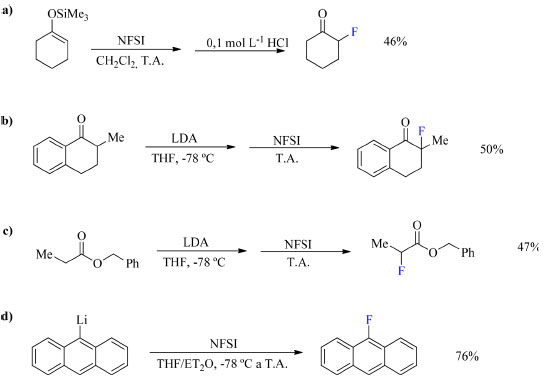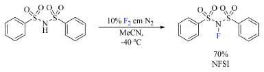 Já o NFSI (N-fluorobenzenosulfonamida, (8) foi sintetizado por Differding e Ofner em 1991 a partir da benzenosulfonamida na presença de F2/N2 em acetonitrila (Esquema 3). Esse reagente é capaz de fluorar nucleófilos tais como éteres enólicos de trimetilsilano (TMS), ânions enólicos de cetonas e ésteres, aril- e vinil-lítios. Entretanto, anéis aromáticos como anisol e tolueno, menos nucleofílicos, necessitam de temperaturas mais elevadas e condições de reação anidra (Esquema 4).19