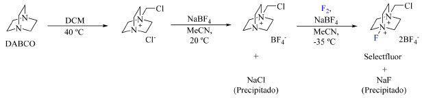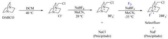 ![]() Esquema 5. Rota de síntese empregada na produção do Selectfluor (fonte: adaptado de Nyffeler e colaboradores)36