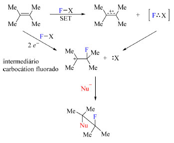 Reagentes de fluoração N-F podem apresentar dois possíveis mecanismos que levam ao mesmo intermediário, um carbocátion fluorado (Esquema 6), e esses possíveis mecanismos são substituição nucleofílica do tipo SN2 ou transferência de um elétron,36 esse último também conhecido pela sigla SET (single-electron transfer). Muitos autores já buscaram desvendar esses dois mecanismos,37,38,39,40 entretanto, cada caso deve ser estudado minunciosamente a fim de concluir sobre qual mecanismo está em ação.