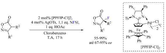 Exemplos modernos de aplicação de fluoração sob condições eletrofílicas Em 2022, Peters e colaboradores41 relataram a fluoração catalítica assimétrica enantiosseletiva de isoxazolinonas formando um centro estereogênico α-carbonílico contendo átomo de flúor, um tipo de catálise muito rara. A motivação desse trabalho foi de obter precursores de γ-aminoálcoois, β-aminoácidos e β-lactamas de interesse medicinal. N-fluorobenzenosulfonamida (NFSI) foi adotado como reagente de fluoração, paladaciclos quirais contendo ferroceno foram empregados como catalisadores, diferentes sais de prata foram responsáveis pela ativação do catalisador, ácido acético ou NaOAc foram empregados como aditivo e clorobenzeno ou tolueno atuaram como solvente da reação. As condições otimizadas da reação estão apresentadas no Esquema 7.