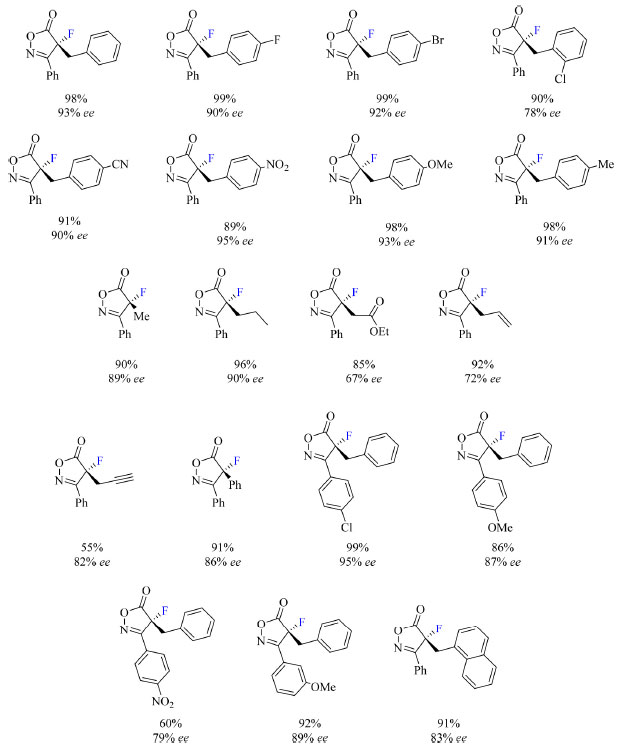 ![]() Esquema 8. Escopo do protocolo de fluoração assimétrica de isoxazolinonas com rendimento dos produtos isolados (fonte: adaptado de Peters e colaboradores)41