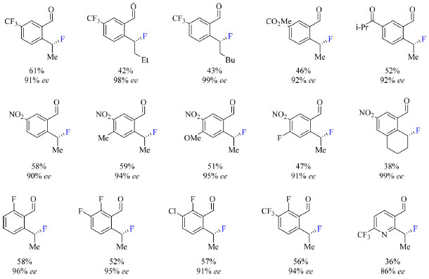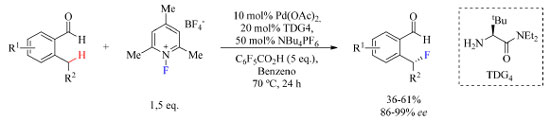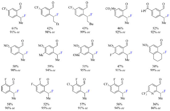 ![]() Esquema 9. Fluoração enantiosseletiva de 2-alquilbenzaldeídos substituídos como substratos catalisada por Pd(II) (fonte: adaptado de Park e colaboradores)42