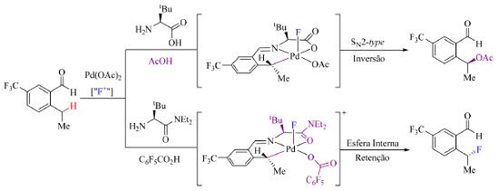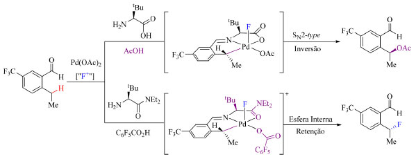 Como grupos TDG os autores empregaram aminoácidos e observaram o aumento do rendimento do produto fluorado com o aumento estérico do TDG. O reagente de fluoração aplicado foi o NFPy 6 (Figura 4) e constatou-se que com aminoácidos menos volumosos esse reagente atua como oxidante auxiliar fornecendo o produto acetilado como principal, ao invés do fluorado. O uso de C6F5CO2H como aditivo da reação permitiu também obter o produto fluorado com alta enantiosseletividade e boa quimiosseletividade. A distinção entre reações de acetilação e de fluoração é que a etapa de eliminação redutiva da primeira ocorre por meio do mecanismo de SN2 enquanto a da segunda reação ocorre por esfera interna, como apresentado no Esquema 10.