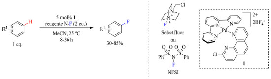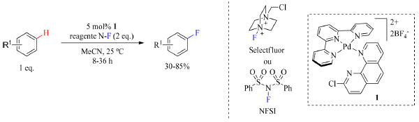 A inserção do átomo do flúor no substrato se dá por um mecanismo radicalar, no entanto, essa inserção é considerada como uma condição eletrofílica, pois os reagentes de fluoração transferem "F+" para o Pd nas condições de estudo. Outros trabalhos corroboram que o mecanismo dessa reação seja entendido como substituição eletrofílica aromática (SEAr).44 Além disso, o protocolo apresenta um problema de regiosseletividade, uma vez que em alguns substratos mais de uma posição, ativada pelo substituinte, foi fluorada. Os trabalhos apresentados não trazem substratos fortemente nucleofílicos e são métodos modernos de inserção de átomos de flúor. Isso demonstra que atualmente o desenvolvimento de novos métodos visa ampliar as classes de compostos que podem sofrer fluoração sob condições brandas empregando reagentes de fluoração conhecidos e simples de serem preparados.