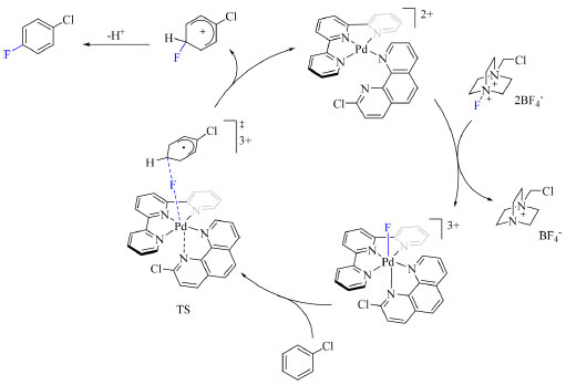 O catalisador é um complexo de Pd(II) que é oxidado por NFSI ou Selectfluor para obter um complexo de Pd(IV)-F. O único estado de transição é caracterizado por ser diradicalar singleto e o mecanismo da reação compreende em duas transferências eletrônicas acopladas com flúor que ocorrem de modo assíncrono, como demostrado no Esquema 13.