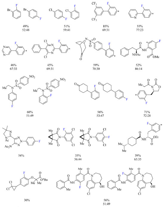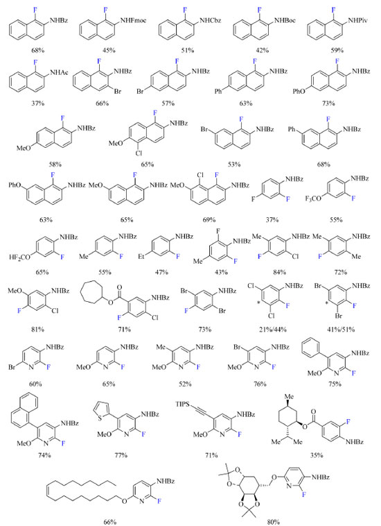 ![]() Esquema 14. Escopo do protocolo de fluoração de arenos com rendimento dos produtos obtido por RMN de 19F (fonte: adaptado de Yamamoto e colaboradores).43 O arterisco denota a posição no anel aromático de fluoração do isômero constitucional não mostrado