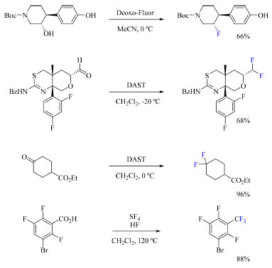 Para a realizar substituições nucleofílicas em substratos alifáticos uma alternativa encontrada foi desenvolver reagentes a partir de SF4 para preparar o fluoreto de alquila desejado através de álcoois, cetonas, aldeídos e ácidos carboxílicos (Esquema 15).2