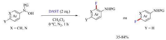 Foram testados diferentes reagentes de fluoração nucleofílica e o DAST originou os melhores resultados. Diclorometano, dimetilformamida, tolueno, dioxano, acetonitrila, acetato de etila, tetracloreto de carbono e clorofórmio foram os solventes testados e clorofórmio foi o escolhido para o desenvolvimento do escopo do trabalho. Também foi observado que o uso de aditivos destinados a promover desprotonação não teve influência no rendimento. As condições otimizadas podem ser encontradas no Esquema 16. O escopo do trabalho, como apresentado no Esquema 17, abrange grupos de proteção no nitrogênio como benzoíla, 9-fluoroenilmetoxicarbonila (Fmoc), benziloxicarbonila (Cbz), terc-butoxicarbonila (Boc), pivaloila (Piv) e acetila. Com N-naftilidroxilaminas contendo o grupo de proteção benzoíla foram testados grupos doadores e retiradores de densidade eletrônica como substituinte Y (Esquema 16) e o método foi compatível com todos estudados, como bromo, fenila, metoxila e anéis de naftil contendo metoxila e cloro. N-fenilidroxilamina substituídas com grupos OCF3, OCF2H, F, metila e etila também foram compatíveis com o método, assim como os substratos contendo o anel de piridina com bromo, metila, metoxila e fenila como exemplos de substituintes.