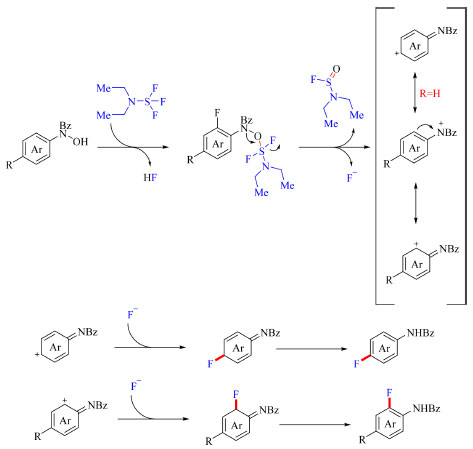 O mecanismo proposto inclui substituição nucleofílica de um átomo de flúor no reagente DAST pelo substrato, seguida da clivagem da ligação N-O formando uma espécie iônica. Essa espécie iônica por sua vez é transformada no carbocátion termodinamicamente mais estável de acordo com o substituinte do substrato, processo que é prontamente acompanhado do ataque do carbocátion por um íon fluoreto. O produto é obtido então após rearomatização, como demostrado no Esquema 18.