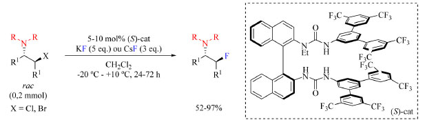 O rendimento dos produtos isolados varia entre 35-84% e uma sugestão para aumentar esses números seria adicionar mais uma espécie no meio reacional que se ligue ao íon fluoreto liberado, de modo a aumentar sua nucleofilicidade e solubilidade no solvente da reação. Essa espécie adicionada não poderia conter grupos funcionais cetona e hidroxila para evitar uma reação lateral com DAST, e poderia interagir por meio de ligação de hidrogênio com o íon fluoreto para aumentar sua nucleofilicidade. Poderia ser usado por exemplo piperidina ou diisopropiletilamina (DIPEA) que são espécies não nucleofílicas. Gouverneur e colaboradores68 empregaram KF como reagente de fluoração e N-etil bis-ureia quiral como catalisador na síntese enantiosseletiva de β-fluoroaminas (Esquema 19). Foi descoberto que um catalisador de ureia pode interagir com íon fluoreto via ligação de hidrogênio e transportá-lo para a solução.