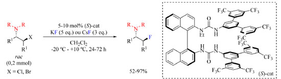 Esquema 19. Síntese enantiosseletiva de β-fluoroaminas a partir de fluoreto de metal alcalino e catalisador com núcleo de ureia (fonte: adaptado de Gouverneur e colaboradores)68