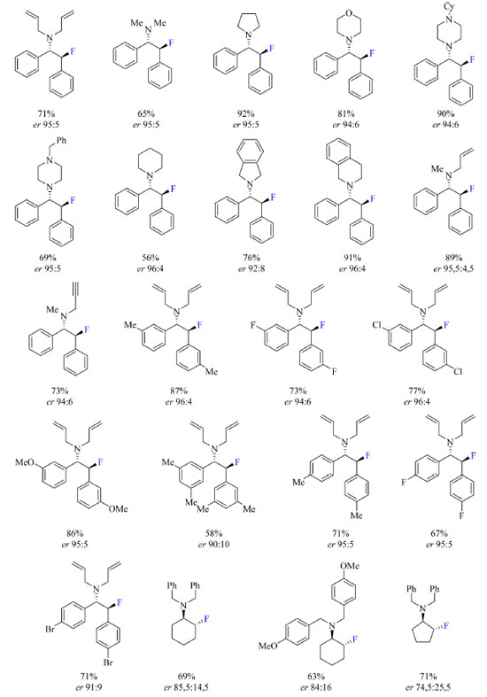 ![]() Esquema 20. Escopo do protocolo de síntese enantiosseletiva de β-fluoroaminas a partir de catalisador de ureia com rendimento dos produtos isolados (fonte: adaptado de Gouverneur e colaboradores)6