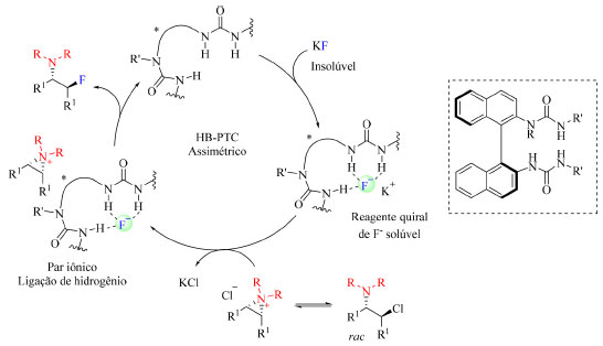 ![]() Esquema 21. Mecanismo proposto para síntese de β-fluoroaminas a partir de KF e catalisador com núcleo de ureia (fonte: adaptado de Gouverneur e colaboradores)>68
