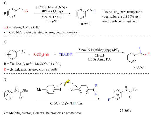 Apesar da economia associada ao uso de reagentes de fluoração de metais alcalinos, os melhores resultados em questão de enantiosseletividade foram obtidos utilizando catalisadores que empregam em sua síntese reagentes bastante custosos, o que significa que não há grandes melhorias no plano econômico quando comparado com outros trabalhos. Além disso, seria interessante incluir no escopo mais substituintes em R1 que incluam grupos nitro e alquil, por exemplo. Por fim, no Esquema 22 são apresentados outros métodos realizados sob condições nucleofílicas que incluem substituição de um grupo ligante diferente de hidrogênio pelo átomo de flúor (a),69 alquilfluoração de olefinas (b)70 e inserção de flúor em sistemas aromáticos por reação eletroquímica (c).71