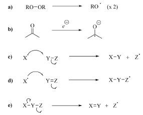 ![]() Esquema 23. Métodos de formação de espécies radicalares: (a) homólise, (b) redução, (c) substituição, (d) adição e (e) eliminação (fonte: adaptado de Clayden e colaboradores)72