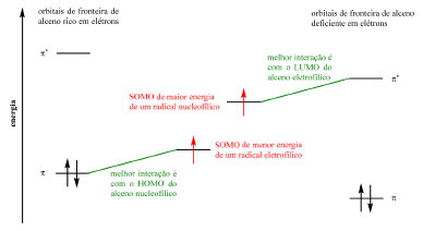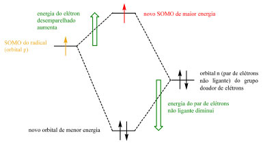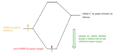 Radicais podem ser estabilizados por grupos retiradores de elétrons por meio da sobreposição do orbital p do radical (single occupied molecular orbital, SOMO) com o orbital π* vazio do grupo substituinte, gerando um novo orbital SOMO de menor energia (Esquema 24) e de caráter eletrofílico (Esquema 25). Radicais podem ser estabilizados por grupos doadores de elétrons por meio da interação entre o SOMO do radical e o par de elétrons não ligante do grupo doador de elétrons que, apesar de gerar um orbital SOMO de maior energia e de caráter nucleofílico (Esquema 25), gera também um orbital de menor energia para acomodar os elétrons do grupo substituinte (Esquema 26). A terceira e última via de estabilização é por meio da conjugação e deslocalização do radical com os elétrons de ligações σ C-H.