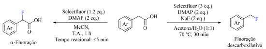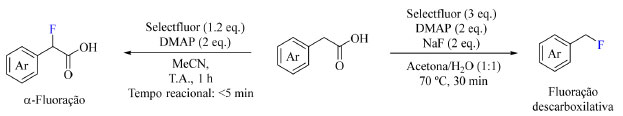 ![]() Esquema 27. Condições otimizadas da fluoração de derivados de ácido fenilacético destacando a α-fluoração (à esquerda) e a fluoração descarboxilativa (à direita) (fonte: adaptado de Pieber e colaboradores)73