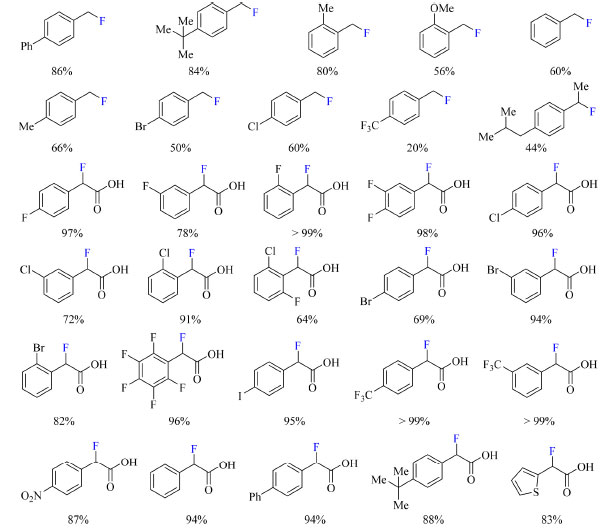 ![]() Esquema 28. Escopo do protocolo de fluoração de derivados de ácido fenilacético via α-fluoração ou via fluoração descarboxilativa com rendimento obtido por RMN de 1H (fonte: adaptado de Pieber e colaboradores)73