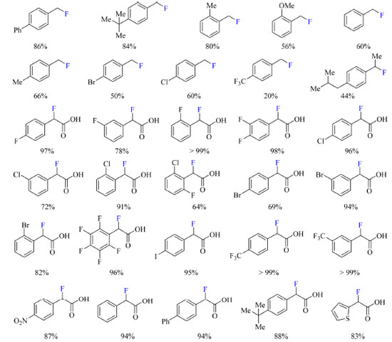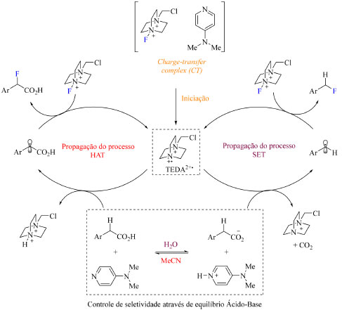 Os autores pretendiam formar um complexo de transferência de carga (CT) entre o Selectfluor e a piridina, de modo a gerar uma espécie dicatiônica radicalar (TEDA2+·), que é um reagente de transferência de átomo de hidrogênio e potente oxidante que pode gerar o radical no substrato e, posteriormente, auxiliar na fluoração. Ao admitir ácido (4-fluorofenil)acético como substrato foi observada a formação do produto de fluoração descarboxilativa em acetona:água e na presença de NaF com aquecimento, enquanto o produto de fluoração direta foi o majoritário em acetonitrila a temperatura ambiente (Esquema 27). O escopo do trabalho abrange substratos com substituintes doadores e retiradores de densidade eletrônica, tais como: haletos, fenila, alquila, metoxila, CF3 e nitro (Esquema 28). Curiosamente ao substituir o ácido carboxílico do substrato por outros grupos funcionais como cetonas, ésteres e amidas os autores não observaram a formação de produto.