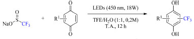 ![]() Esquema 30. Condições otimizadas da trifluorometilação de derivados de benzoquinonas (fonte: adaptado de Cho e colaboradores)74