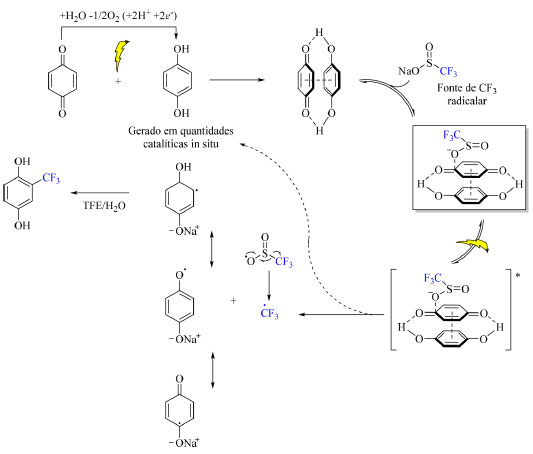 O mecanismo da reação compreende a geração in situ de hidroquinona a partir do substrato de benzoquinona em solvente prótico com foto-irradiação, seguida da formação de um complexo CT entre o substrato (espécie deficiente de elétrons) e a hidroquinona (espécie rica em elétrons), o qual é estabilizado por ligações de hidrogênio e interações π-π. Posteriormente, é adicionado o reagente de trifluorometilação, CF3SO2Na levando a formação de um complexo CT ternário intermediário e, logo em seguida, do produto de acordo como está demostrado no Esquema 31.