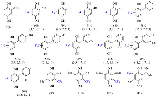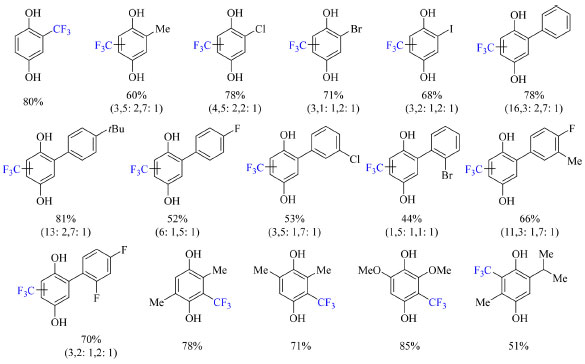 ![]() Esquema 32. Escopo do método de trifluorometilação de derivados da benzoquinona via foto-irradiação. Nos casos pertinentes a razão dos regioisômeros formados nas posições 3, 5 e 6 do anel da hidroquinona se encontra seguido do rendimento, o qual é dos produtos isolados ou obtido por RMN de 19F devido a voltatilidade dos produtos (fonte: adaptado de Cho e colaboradores)74