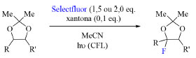 O trabalho desenvolvido por Lectka e colaboradores75 na fluoração de cetais emprega tanto o mecanismo HAT, observado no exemplo de fluoração de derivados do ácido fenilacético,73 quanto o uso da fotoquímica, como apresentado no último exemplo discutido.74 Esse novo método visa a síntese de novos açúcares e esteroides fluorados, o que é desafiador devido a proposta dos autores de realizar a fluoração dos substratos de forma regiosseletiva. O melhor rendimento da reação foi alcançado empregando a luz de uma lâmpada fluorescente compacta (CFL, do inglês compact fluorescent light) na presença de xantona e do reagente de fluoração Selectfluor, tal como é apresentado no Esquema 33.