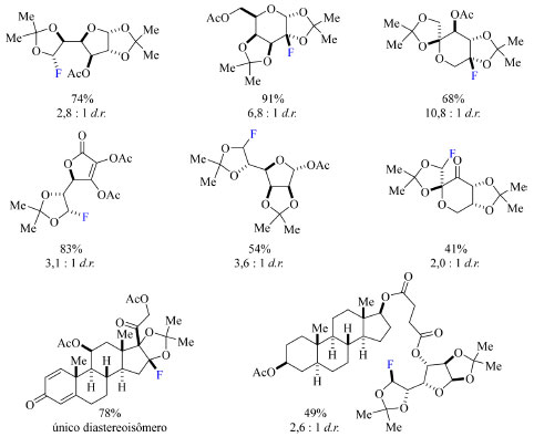 ![]() Esquema 34. Escopo do método de fluoração de moléculas policíclicas complexas contendo grupo cetal, com os rendimentos obtidos por RMN de 19F (fonte: adaptado de Lectka e colaboradores)75