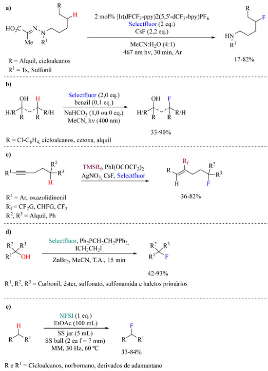Para encerrar a discussão sobre fluorações sob condições neutras no Esquema 36 estão representados alguns métodos adicionais relatados recentemente, especificamente os protocolos de Yu e colaboradores76 (a), Lectka e colaboradores77 (b), Zhu e colaboradores78 (c), Xiao e colaboradores79 (d), e Hong e colaboradores80 (e).