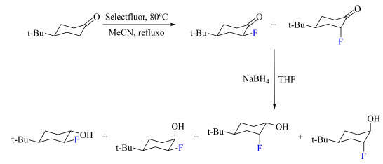 ![]() Esquema 37. Reação de α-fluoração da 4-terc-butil-cicloexanona com SelectFluor como agente de fluoração seguida da reação de redução gerando quatro isômeros de álcoois fluorados (fonte: adaptado de Dal Poggetto e colaboradores)87