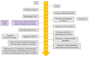 ![]() Figura 1. Desenvolvimento histórico da química de organofluorados (fonte: adapatado de Hu e colaboradores)5