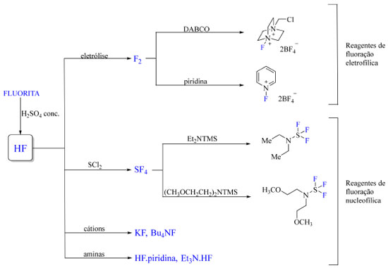 ![]() Figura 2. Preparo dos reagentes de fluoração mais comuns em química de organofluorados (fonte: adaptado de Harsanyi e Sandford)20