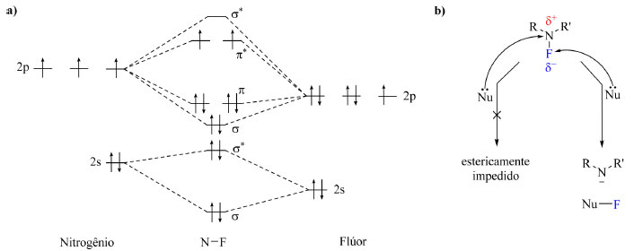 ![]() Figura 3. Diagrama de orbitais moleculares da molécula N-F (a) e representação de um ataque nucleofílico a uma molécula contendo uma ligação N-F (b)