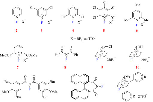 Muitos dos reagentes de fluoração N-F estão disponíveis comercialmente e estão divididos em dois grupos, neutros e de amônio quaternário, sendo o último grupo considerado como tendo caráter mais eletrofílico.22 Os mais comercializados atualmente são os sais de N-fluoropiridínio ou NFPy (2-7),23,24 NFSI (8),25 Selectfluor (9)26 e Accufluor (10),27 e os desenvolvidos mais recentemente são derivados do NFSI (11-12),28,29 derivados quirais do Selectfluor (13-14)30,31 e reagentes baseados em N-fluoro-N-arilsulfonamidas (15),32 de acordo com a Figura 4.