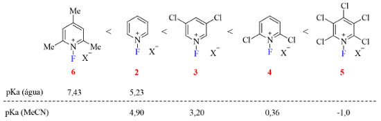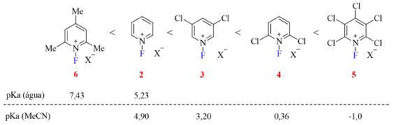 ![]() Figura 5. Poder de fluoração dos sais de N-fluoropiridínio (fonte: adaptado de Umemoto e colaboradores).19 Valores de pKa das piridinas correspondentes em água33,34 e em acetonitrila35