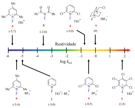 ![]() Figura 7. Escala de reatividade relativa ao Selecfluor de reagentes N-F de fluoração eletrofílica (fonte: adaptado de Rozatian e Hodgson)22