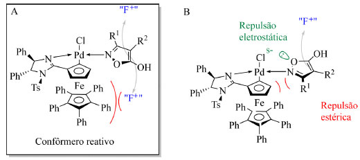 O mecanismo dessa reação consiste na coordenação do átomo de nitrogênio do substrato isoxazolínico com o Pd(II) na posição trans ao átomo de nitrogênio do catalisador. Após a coordenação ao paládio, há a enolização do substrato e duas possíveis conformações são esperadas: A, que resulta no produto principal, e B, que apresenta repulsão estérica entre o substituinte do substrato e o ferroceno e entre um dos oxigênios com o ligante cloro do Pd (Figura 8). Por fim, o reagente de fluoração reage com a face do enol mais distante do ferroceno, menos impedida, levando à formação do centro estereogênico com a configuração observada pelos autores.