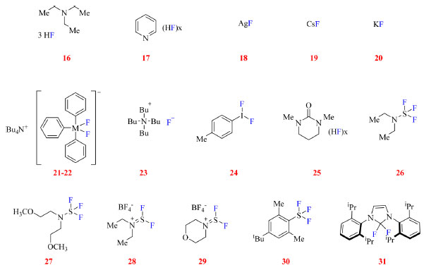 MÉTODOS DE INSERÇÃO DE ÁTOMOS DE FLÚOR SOB CONDIÇÕES NUCLEOFÍLICAS Nas fluorações sob condição nucleofílica, o substrato atua como eletrófilo enquanto o flúor atua como nucleófilo. Levando em consideração as propriedades do átomo de flúor seria esperado que o método mais simples de sua inserção em uma molécula orgânica seria a substituição de um grupo de saída pelo flúor (via SN2). Todavia essa reação não é tão simples assim, uma vez que o ânion fluoreto tem alta energia de hidratação atuando mais como base e sendo um nucleófilo fraco.2,45 A fim de contornar essa questão, HF pode ser ligado a uma espécie básica, como trietilamina (16) ou piridina (17), no entanto, esses complexos podem afetar negativamente reações orgânicas ao reduzir a acidez do meio e/ou complexar fortemente com catalisadores de metal de transição prejudicando seu desempenho.1 Ou então podem ser empregadas outras fontes de flúor tais como fluoretos de metais alcalinos (18-20), silicatos ou estananas hipervalentes (21-22), fluoreto de tetrabutilamônio (23) e iodo hipervalente (24), como mostrado na Figura 9.