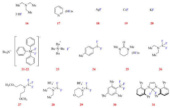![]() Figura 9. Reagentes de fluoração nucleofílica (fonte: adaptado de Hollingworth e Gouverneur, e Paquin e colaboradores)45,21