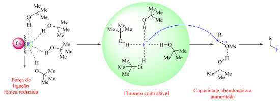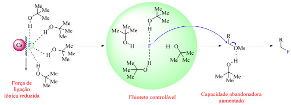 Os fluoretos de metais alcalinos são abundantes, no entanto, apresentam baixa solubilidade em solventes orgânicos.46 Esse problema, em alguns casos, pode ser resolvido usando álcoois volumosos para que o flúor seja transferido para a fase orgânica e possa vir a reagir como nucleófilo. O par iônico M+F− (M = K ou Cs, por exemplo) interage via ligação de hidrogênio com moléculas do álcool volumoso comprometendo a força da ligação iônica MF, o que por sua vez leva a solvatação do íon fluoreto, permitindo-o atuar como nucleófilo, como ilustrado na Figura 10.1,47 De acordo com os cálculos de DFT (density functional theory) e as simulações de dinâmica molecular conduzidas por Pliego Junior,48 nos casos nos quais o metal ligado ao flúor ionicamente é potássio e o álcool volumoso o terc-butanol, o par iônico KF é solvatado por cinco moléculas de solvente em média, sendo que o íon fluoreto participa de quatro ligações de hidrogênio com as moléculas do álcool, e o íon de potássio apresenta quatro átomos de oxigênio ao seu redor provenientes também do álcool. Em resumo, três moléculas de solvente solvantam tanto F− quanto K+, uma molécula extra interage com o fluoreto e uma outra molécula extra interage somente com o íon de potássio. Chi e colaboradores,47 pesquisadores que desenvolveram esse tipo de reação de fluoração SN2 usando álcool como solvente, também reportaram que o uso de álcoois volumosos são eficientes na supressão da formação de produtos laterais.