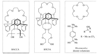 Uma outra abordagem para que o aumento da solubidade de sais de fluoreto possa ser alcançado é o uso de macrocíclicos, os quais também atuam interagindo com ambas espécies, cátions e ânions, presentes no meio reacional, solubilizando o sal e ativando o nucleófilo (íon F-).49 Alguns exemplos desenvolvidos nos últimos anos (Figura 11) incluem os trabalhos de Kim e colaboradores50,51 com os macrocíclicos nomeados de BACCA e BTC5A, os quais são destaques por serem constituídos por um éter de coroa que atua como quelante do cátion metálico e cadeias contendo álcoois que interagem via ligação de hidrogênio com o íon fluoreto, e os trabalhos de Pliego Junior e colaboradores52,53,54 que empregam éteres de coroa da classe de 18-crown-6, os quais atuam como quelantes do cátion metálico, juntamente com álcoois volumosos que interagem via ligação de hidrogênio com o íon fluoreto.